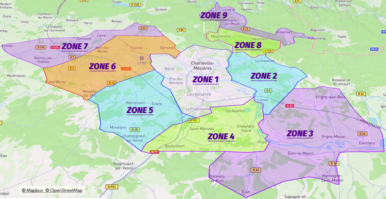En vélo-cargo, avec ou sans remorque, nous effectuons les livraisons du lundi au samedi sur 62 communes des Ardennes réparties en 9 zones. Le découpage des zones et des créneaux de livraison est réalisé selon plusieurs critères : la distance, la facilité d'accès et le dénivelé.